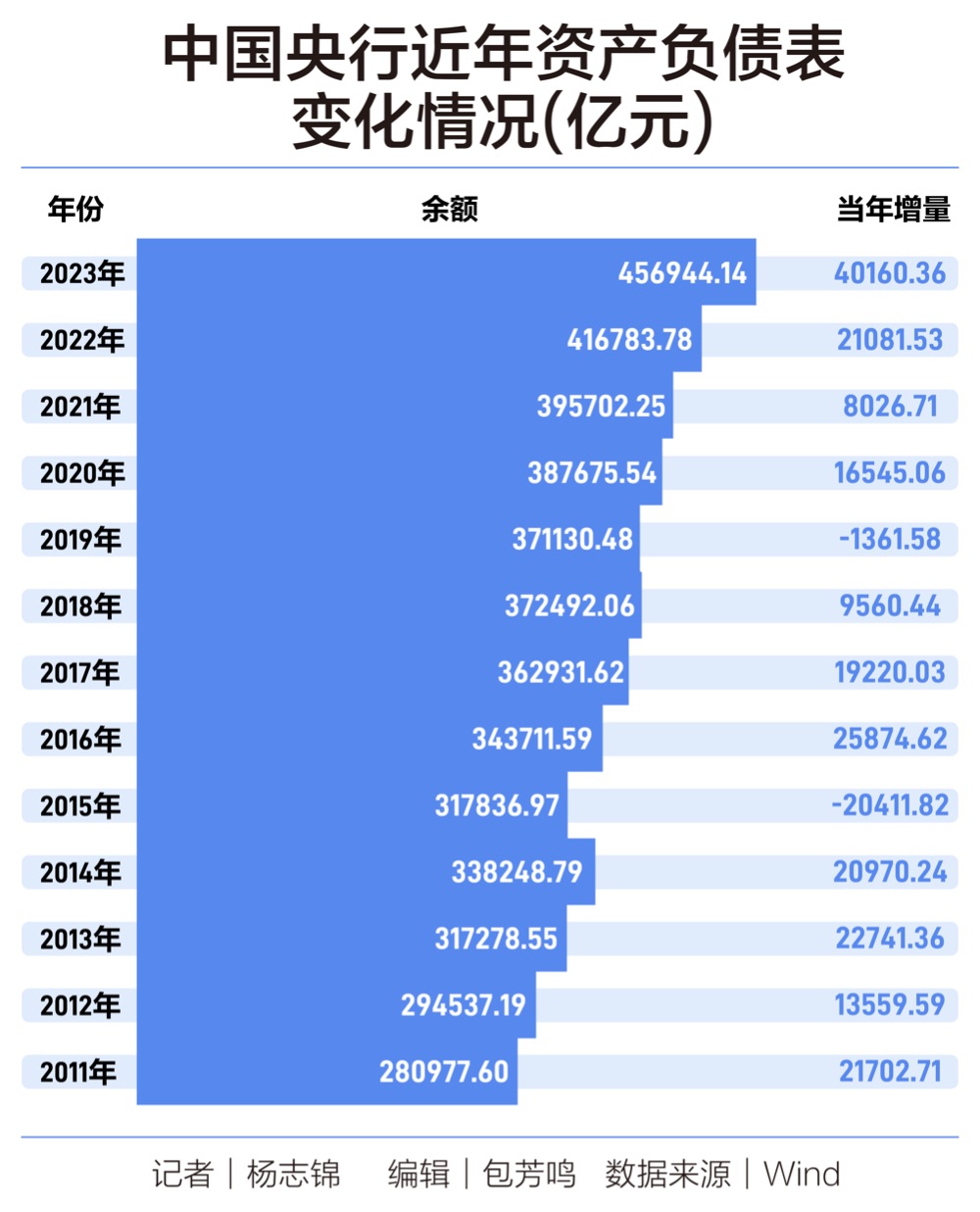 而从2022年起,中央央行资产负债表的扩张速度有所加快,当年新增2.1万亿元至41.7万亿元,2023年新增4万亿元至45.7万亿元。