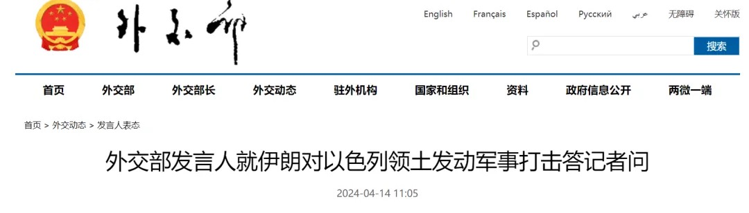 4月14日,中国外交部发言人表示,中方对当前事态升级深表关切,呼吁有关方面保持冷静克制,避免紧张局势进一步升级。这一轮形势升级是加沙冲突外溢的最新表现。当务之急是切实落实联合国安理会第2728号决议,尽快平息加沙冲突。中方呼吁国际社会特别是有影响力的国家,为维护地区和平稳定发挥建设性作用。